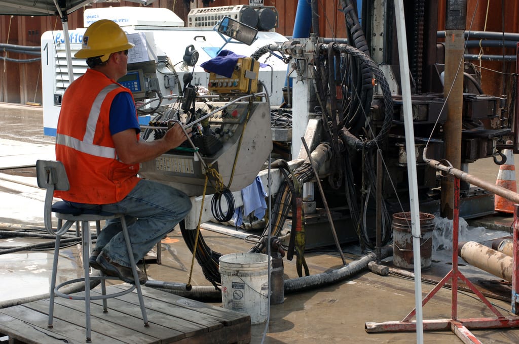 A contract driller operates a rig on a foundation remediation project at Wolf Creek Dam in Jamestown, Kentucky, in this 2011 image. Source: Lee Roberts / U.S. Army Corps of Engineers–Nashville District